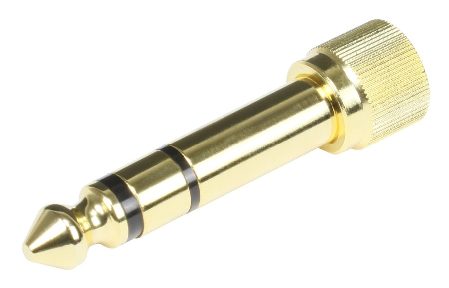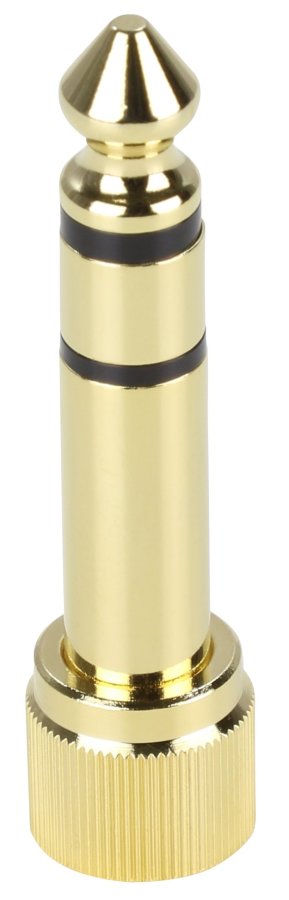 This adapter converts a 3.5mm (1/8") plug into a 1/4" TRS plug. Commonly used as a headphone adapter to switch between the Pro Audio standard 1/4" jack and the common consumer electronics standard 3.5mm plug.