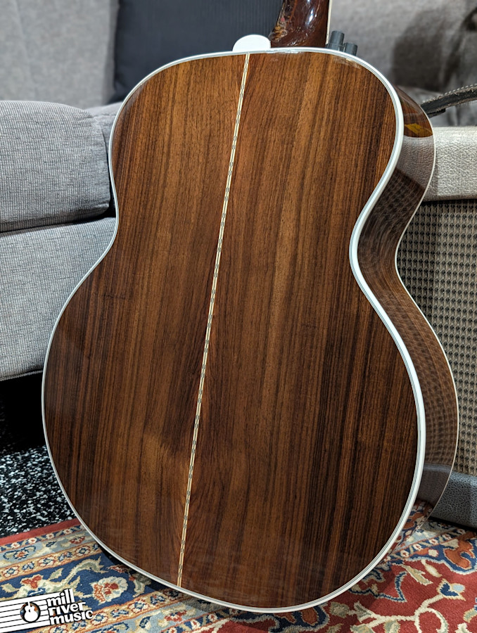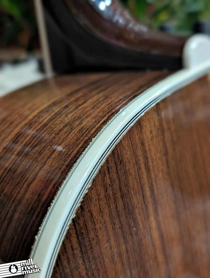The guitar is a wonderful player and sounds fantastic. It has been professionally set up with medium action, and there is plenty of room on the saddle to go lower if you prefer a sleeker feel. Structurally, the guitar is quite healthy; the beautiful spruce top is nice and flat overall, with only a small, common area of minor bellying below the bridge on the treble side. The rosewood back and sides are stunning and contribute to the rich, complex overtones this model is famous for.