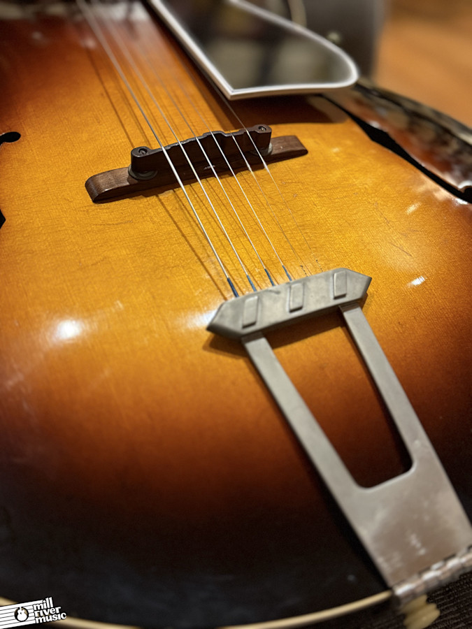 This L-7 is in Very Good condition for an instrument that has lived for 85+ years. It has been carefully assessed by our techs and is completely structurally sound, from the bracing to the neck joint. As is expected with an X-braced archtop of this vintage, the top has sunk some over the years, but it is stable and does not prevent this guitar from being dialed in. It has just had a professional setup and plays wonderfully.