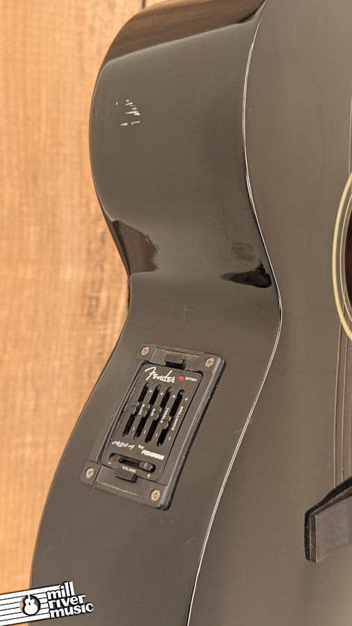 The Fender Scorpion is a rare and distinctive "acoustic with an attitude," part of Fender’s Special Edition series from the early 2000s. With its sleek black finish, matching headstock, and unique scorpion inlay at the 12th fret, this guitar was designed for players who want the comfort of a Fender neck with a darker, more modern aesthetic. It features a spruce top and mahogany back and sides, delivering a crisp, punchy tone that cuts through a mix.