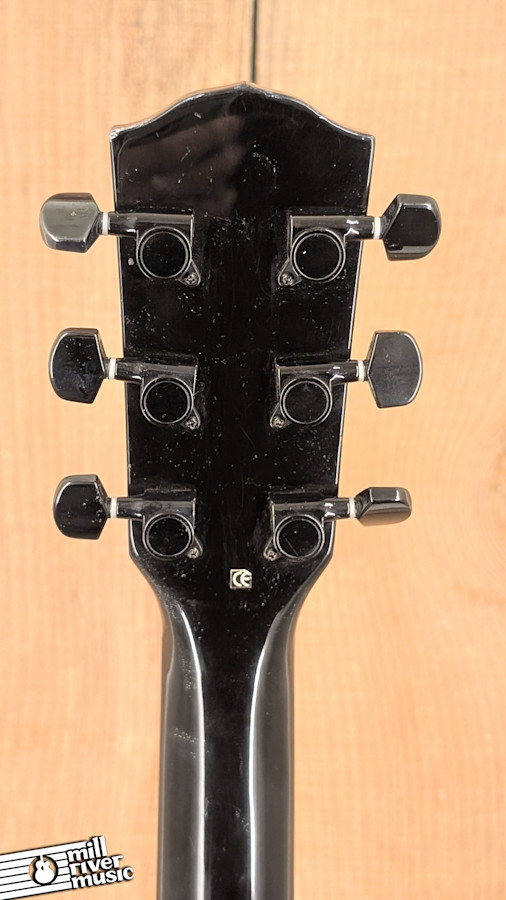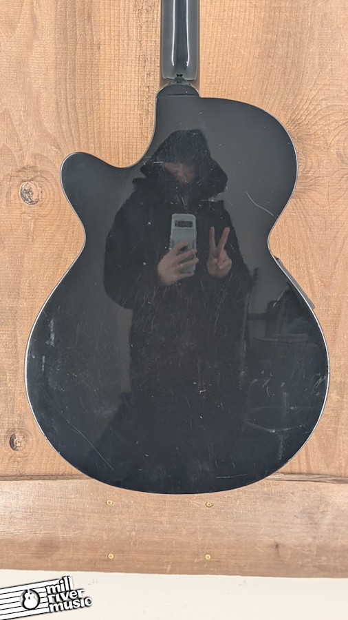 This guitar has been professionally inspected and set up in our shop, and it is playing perfectly right at factory specifications. The onboard electronics and pickup system have been fully tested and are working exactly as they should. Cosmetically, this is a well-loved instrument; the gloss black finish shows typical surface swirling along with lots of heavy scratching throughout the body, as is common with black guitars that have seen plenty of stage time.