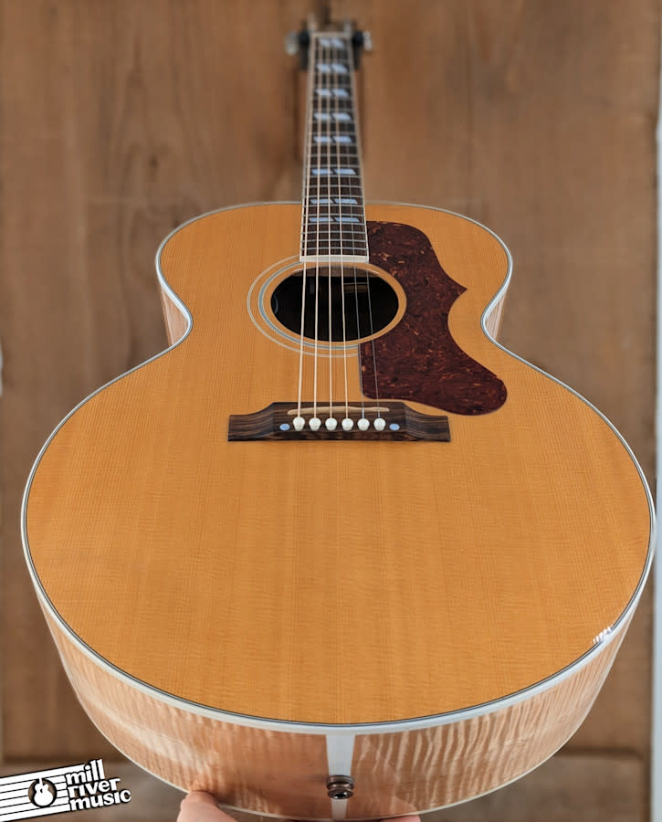 This Gibson J-185 from 2007 is a stunning example of Gibson's classic small jumbo, renowned for its comfortable feel and balanced, articulate tone. The beautiful flame-figured maple back and sides, coupled with a natural Sitka spruce top, create a visually striking instrument. Sonically, this guitar delivers a crisp and loud sound that lasts for days, with the focus and projection that maple is famous for.