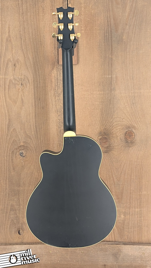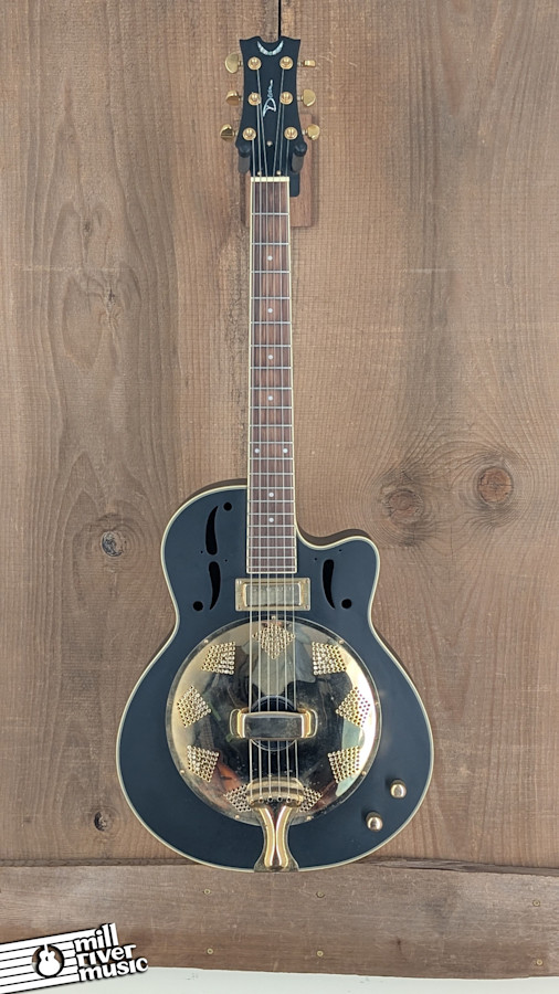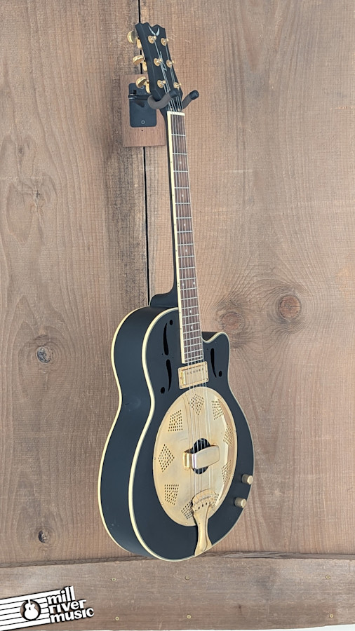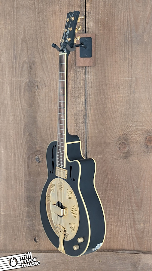 This Dean resonator brings a unique, aggressive aesthetic to the world of acoustic-electric instruments. Featuring a sleek black satin finish accented by gold hardware and Grover tuners, it is built for the player who wants a resonator that stands out from the traditional crowd. The guitar has been professionally set up in our shop with a fresh set of strings and features a nice low action, making it incredibly easy to play for an instrument of this style.