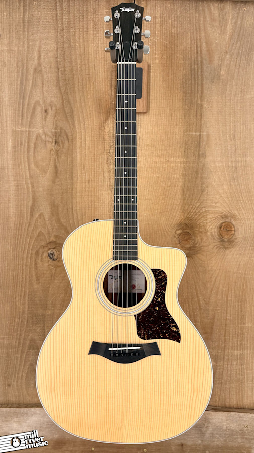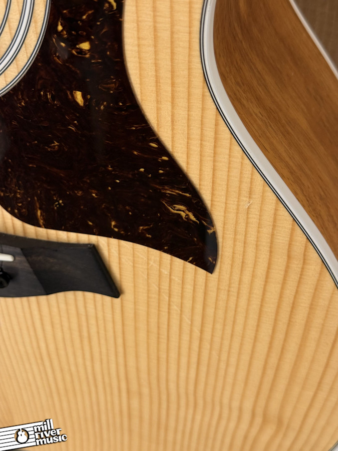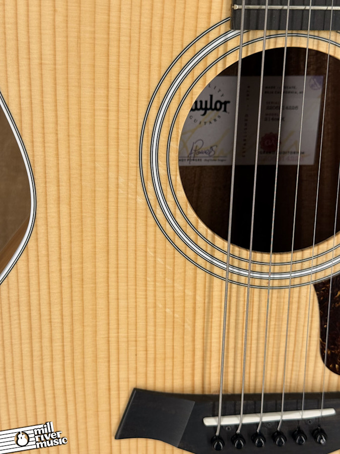 This single-owner instrument has been professionally set up to Taylor factory spec by a certified shop. It is in Very Good condition, the only signs of wear are the expected pick strumming marks on the top, primarily around the pickguard and soundhole (please see pictures). The Venetian cutaway and Taylor's ES2 electronics make this guitar a comfortable and reliable choice for both acoustic playing and stage performance. It comes with its original tan Taylor padded gig bag.