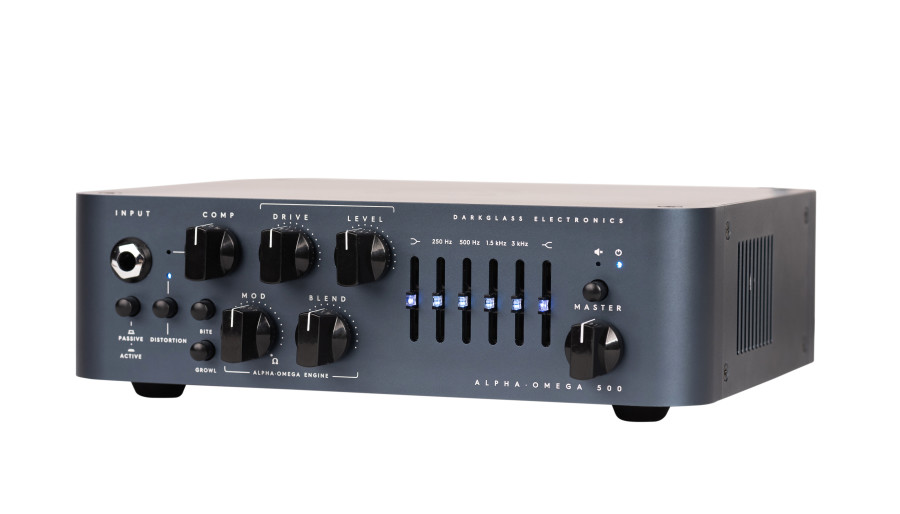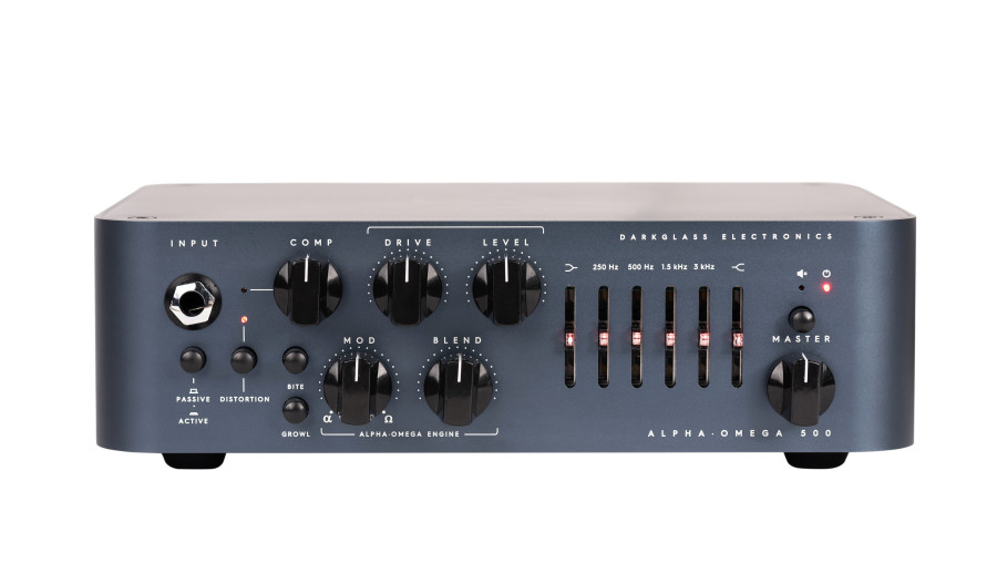 The Alpha·Omega 500 is a 500W amplifier equipped with an all-analog preamplifier, two distinct distortion circuits (Alpha and Omega), a custom-designed Darkglass high-efficiency class D Module, an ultra-quiet graphic equalizer, and a digital impulse-response cabinet emulator for DI outputs or headphones.
