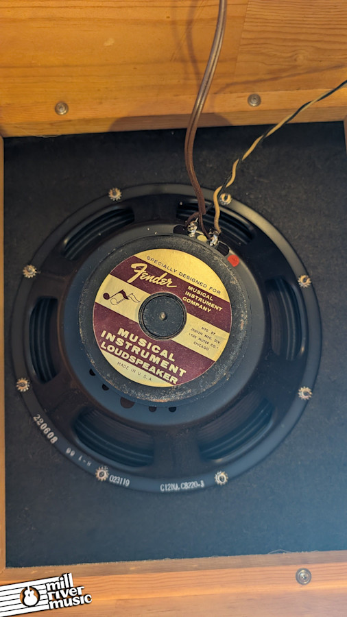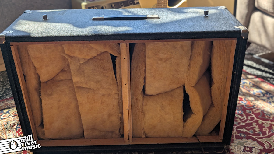 This cabinet is loaded with its **original Jensen C12NA speakers**, which are widely considered some of the finest ceramic speakers Fender ever utilized. These drivers are famous for their high power handling, sparkling highs, and a robust low-end that stays clear even when the amp is pushed into saturation. The interior of the cabinet still retains its **original yellow fiberglass insulation**, which is crucial for dampening internal standing waves and achieving the authentic, period-correct resonance this cabinet was designed for.