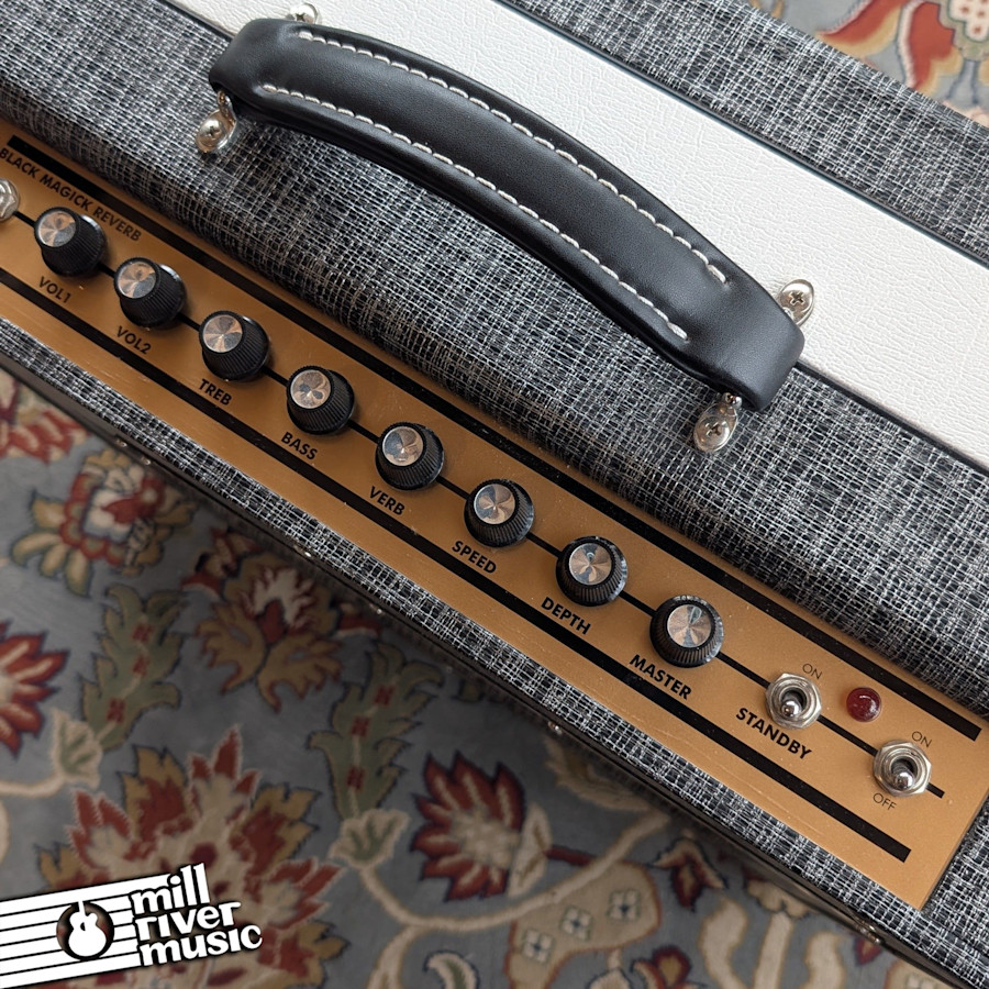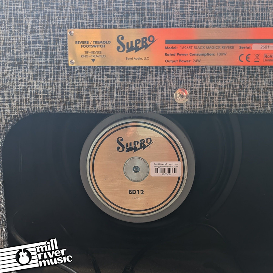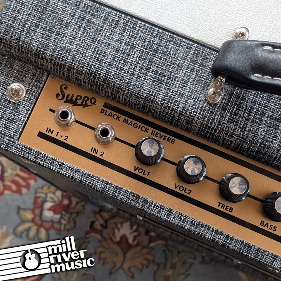 The Black Magick Reverb Combo embodies the all-tube snarl and sweetness that define the Supro sound. Featuring analog spring reverb, 2-band EQ, and a master volume knob, the Black Magick Reverb was designed with maximum flexibility in mind. Two independent preamp channels can be linked together using the "1 + 2" input jack to obtain fat tone, while utilizing only Input 2 will yield a more agile sound. The Black Magick Reverb’s 3-spring reverb pan is driven by both channels and then summed with the dry signal just before the master volume control. An updated, tube-based LFO circuit provides bias-modulated output tube tremolo with double the speed range of the original Black Magick.