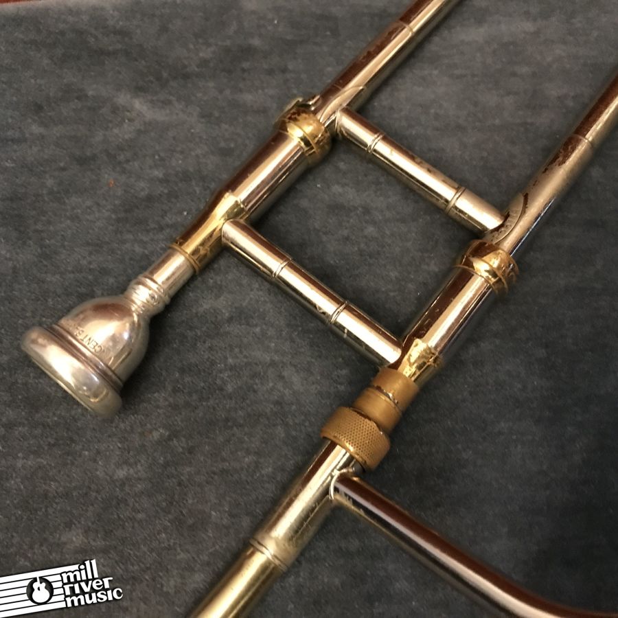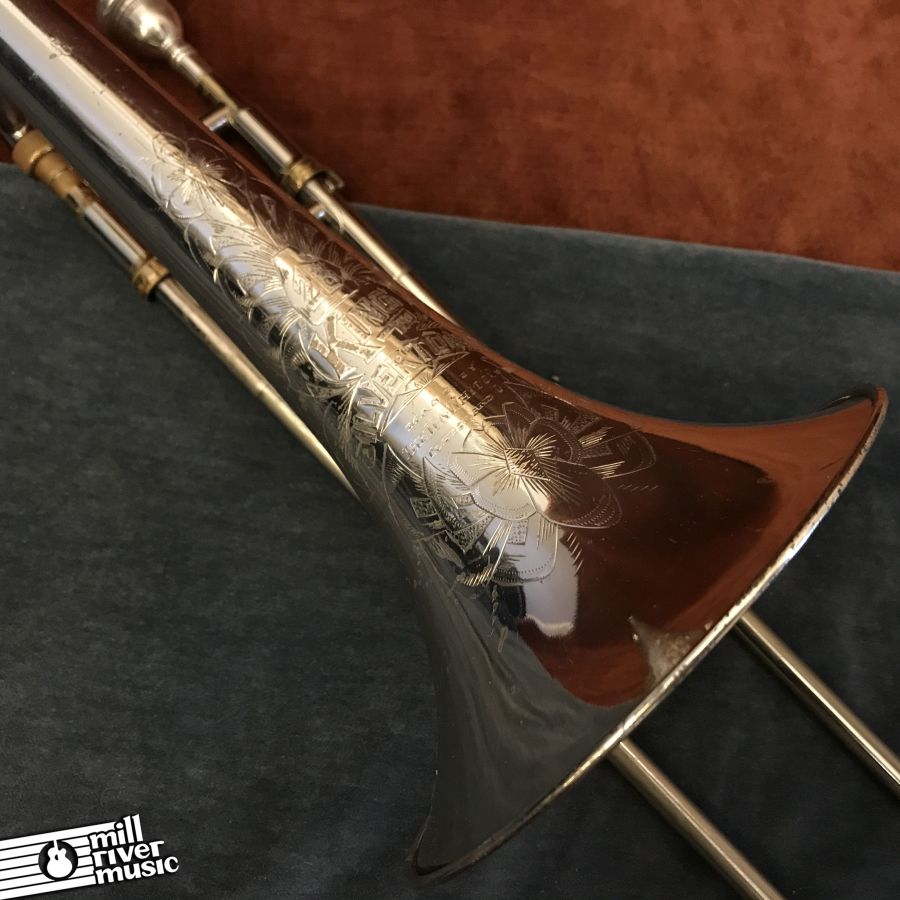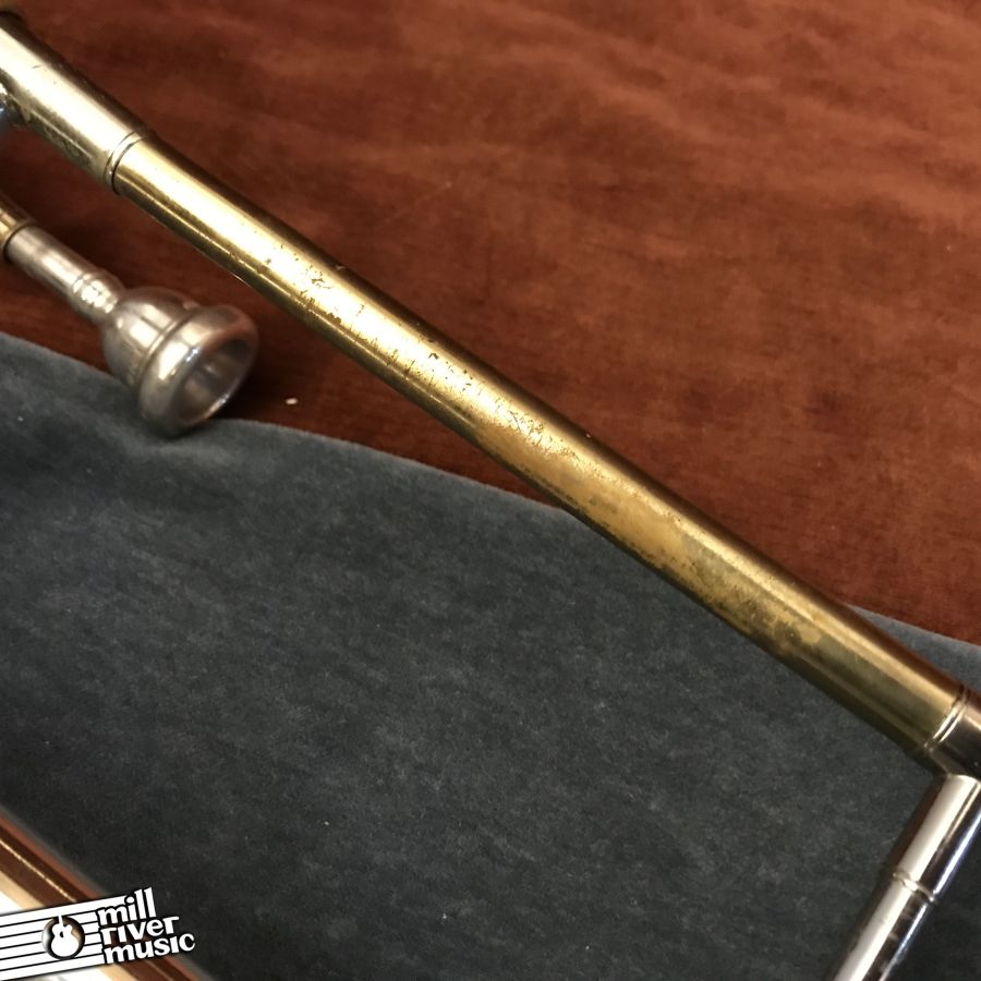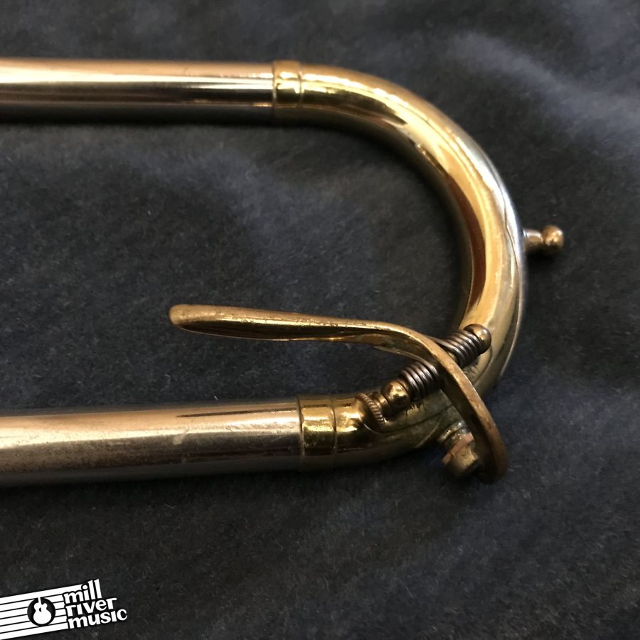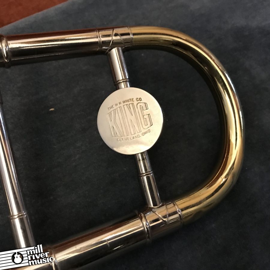 Used, vintage, in good playing condition. This is a King 2B Silvertone Tenor Trombone dated to 1940 that includes a nice Kaces Durafoam Case and a Bach Mount Vernon 14D Mouthpiece. A sweet and true tone with pro playability and dynamics - a solid silver bell with dual bore that allows for a warm and dark response. This is a serious player for a gigging professional or serious student and is among the roster of classic, professional bones on the market. Normal signs of wear and tear from standard play over the years (see photo series), a few superficial shallow dents and lacquer wear/patina mostly. Recently given minor maintenance by our local tech and ready for gigging season or sessions in the studio!