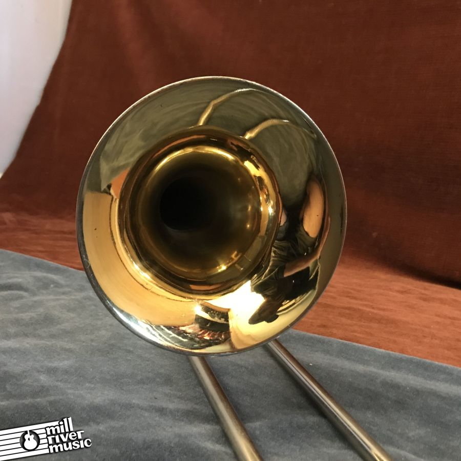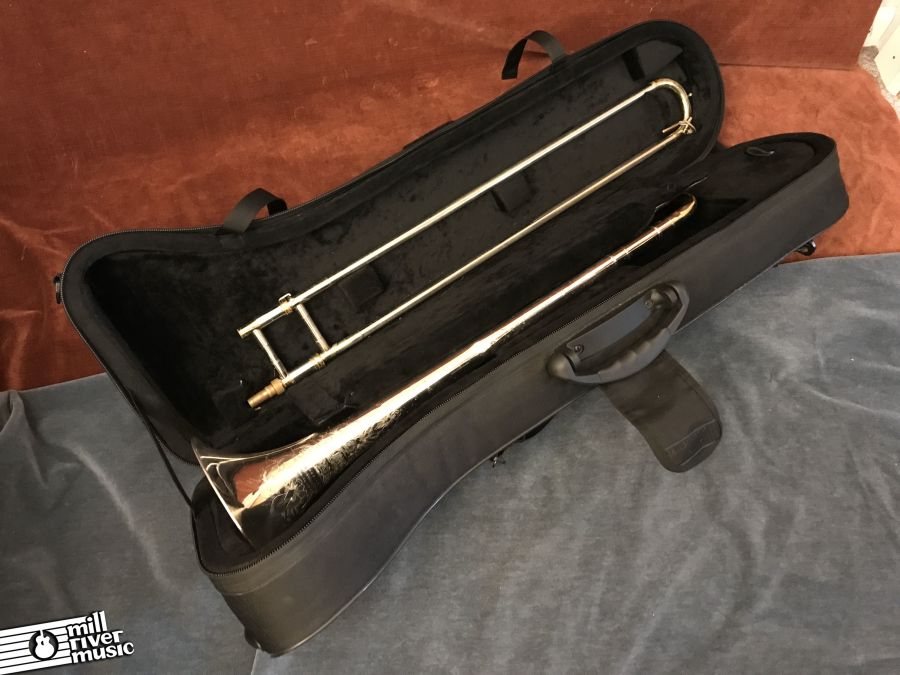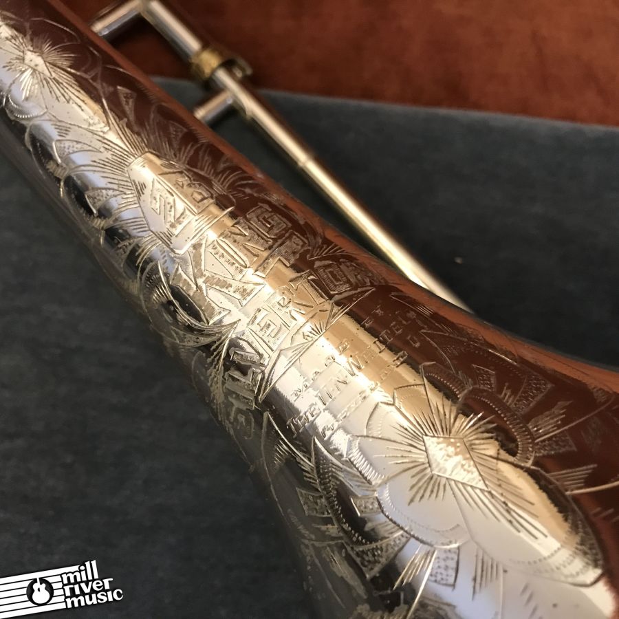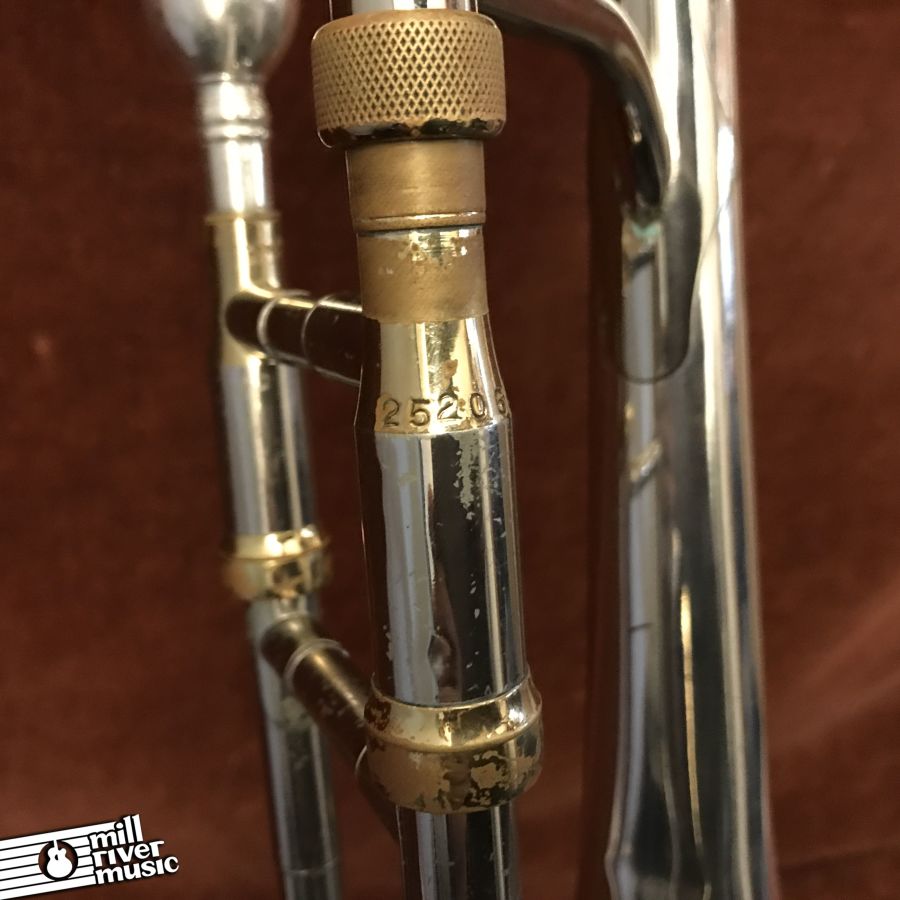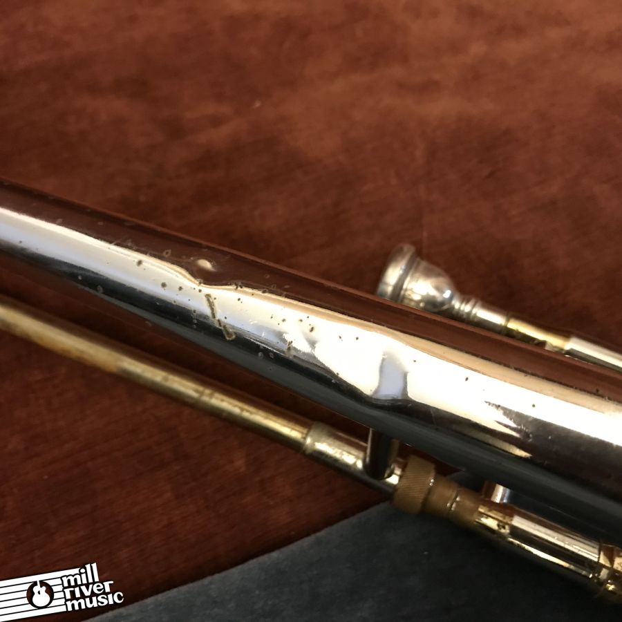 Used, vintage, in good playing condition. This is a King 2B Silvertone Tenor Trombone dated to 1940 that includes a nice Kaces Durafoam Case and a Bach Mount Vernon 14D Mouthpiece. A sweet and true tone with pro playability and dynamics - a solid silver bell with dual bore that allows for a warm and dark response. This is a serious player for a gigging professional or serious student and is among the roster of classic, professional bones on the market. Normal signs of wear and tear from standard play over the years (see photo series), a few superficial shallow dents and lacquer wear/patina mostly. Recently given minor maintenance by our local tech and ready for gigging season or sessions in the studio!