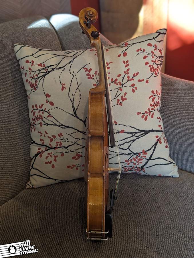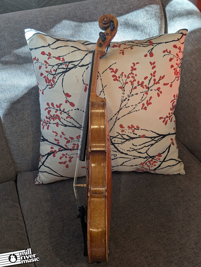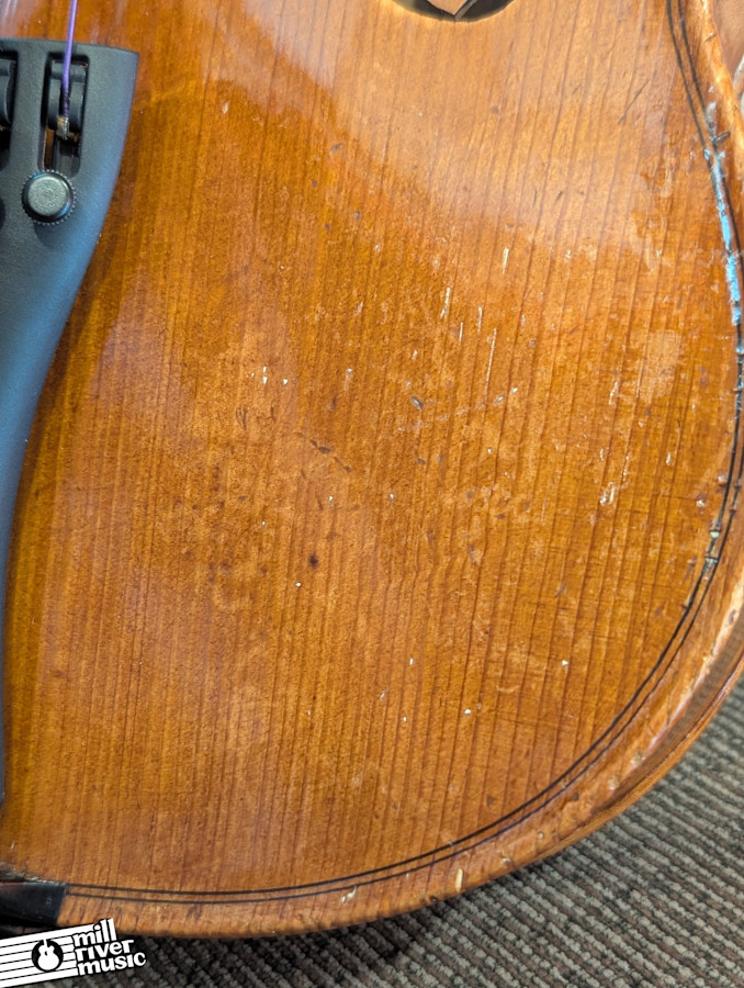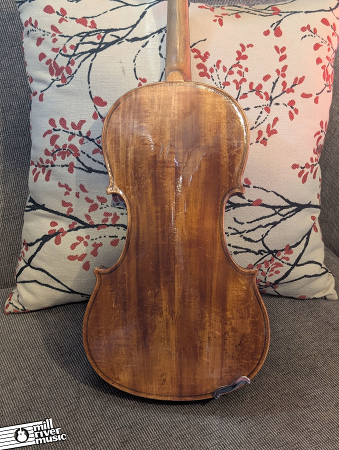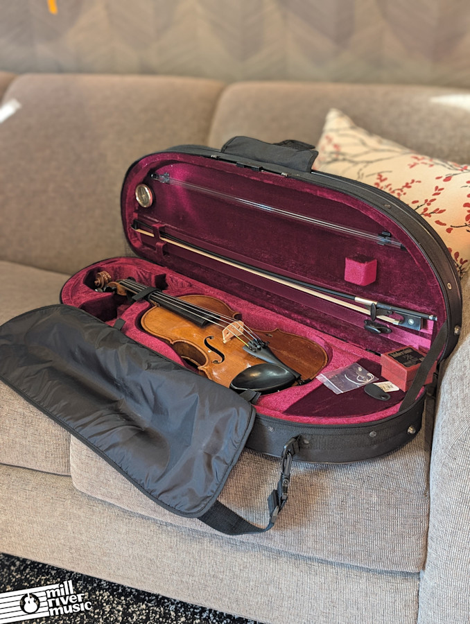The instrument shows no signs of any past repairs and has been well cared for. It has been set up and is playing very well, ready for its next owner. This complete outfit includes a nice hardshell case and has been upgraded with a carbon fiber bow, which is a significant improvement in durability and performance over standard wood bows. With four fine tuners for easy and accurate tuning, this is a perfect package for a student looking for a reliable and good-sounding instrument.