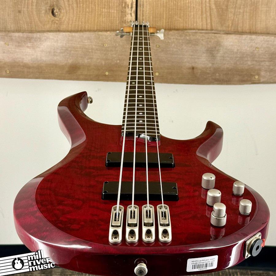 The Ibanez BTB (Boutique Bass) series was designed to offer high-end features and playability at a working musician's price point. This 2001 BTB400QM is a fantastic example of that mission, featuring a 35" extra-long scale length for increased string tension and superior articulation, especially on the lower strings. The Transparent Red finish over a Quilted Maple top gives it a premium look that stands out on any stage.