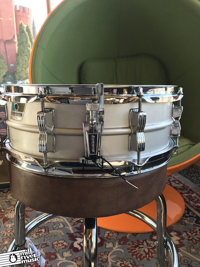 This 1970s Ludwig Acrolite snare drum is a classic, sought-after model known for its dry, articulate tone and iconic brushed aluminum finish. Featuring the original **Blue & Olive badge**, this 5"x14" snare is a great example of the USA-made student/professional crossover drums that have become go-to tools in studios and on stage for decades.