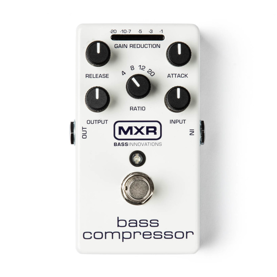 Take your favorite studio compressor to the stage with the MXR Bass Compressor. A complete array of controls-Attack, Release, Ratio, Input, and Output-makes it easy to fine-tune your sound, from subtle peak limiting to hard squashed compression effects. Its CHT™ Constant Headroom Technology gives you plenty of headroom and clear performance. This totally transparent compressor allows your full dynamic range to shine through until your signal reaches the compression threshold, which is indicated by the ten, highly visible gain-reduction status LEDs. It's all packed into a durable, lightweight aluminum-housing pedal that's the size of a Phase 90.