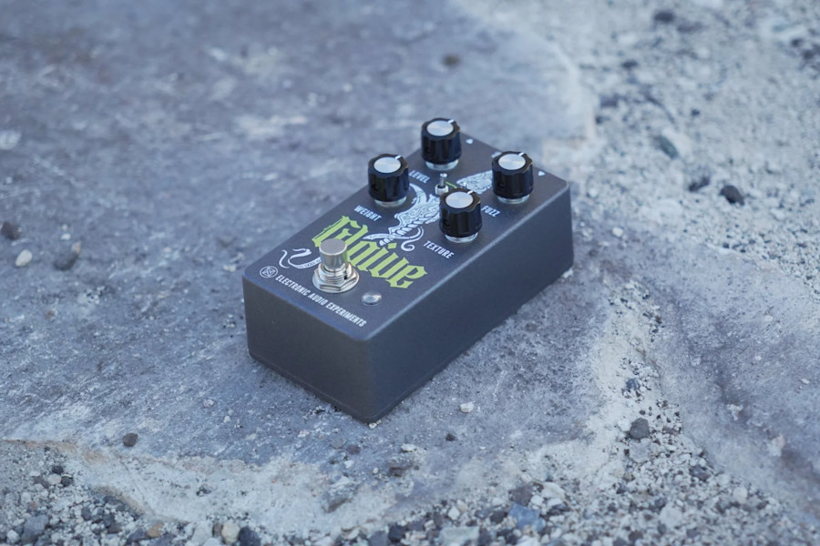 The Electronic Audio Experiments Glaive is the most dangerous gain device in the EAE lineup. This discordant yet deceptively versatile op amp fuzz is capable of over +80dB of gain. The Weight knob adjusts a lightly resonant high pass filter at the input, for tones ranging from tight, ripped- speaker grind to bass-rich sludge. Texture blends in a full-wave rectified analog signal, producing an octave up that gets fed into the fuzz input. Use it for subtle scrambling, or to generate piercing intermodulation products and sub-bass artifacts with a synthesizer-like attack. The LPF toggle can focus harsh overtones or unleash a full-spectrum cut through any mix. Finally, the Squelch toggle enables a brute-force, highly effective bias gate that can temper even the most fanatical gain levels and impart a crumbly, ripping quality to the note decay.