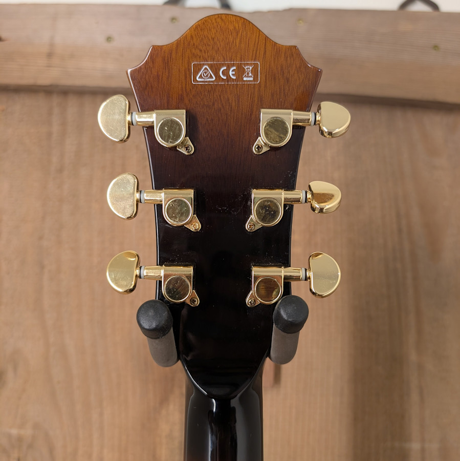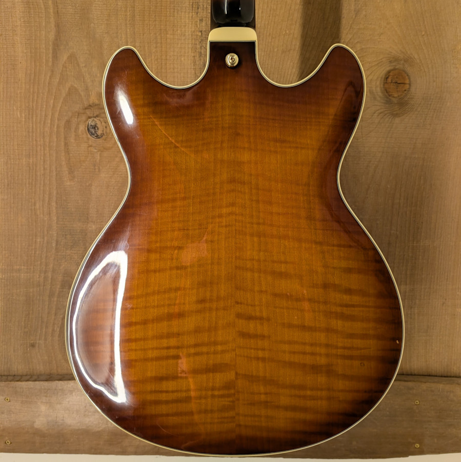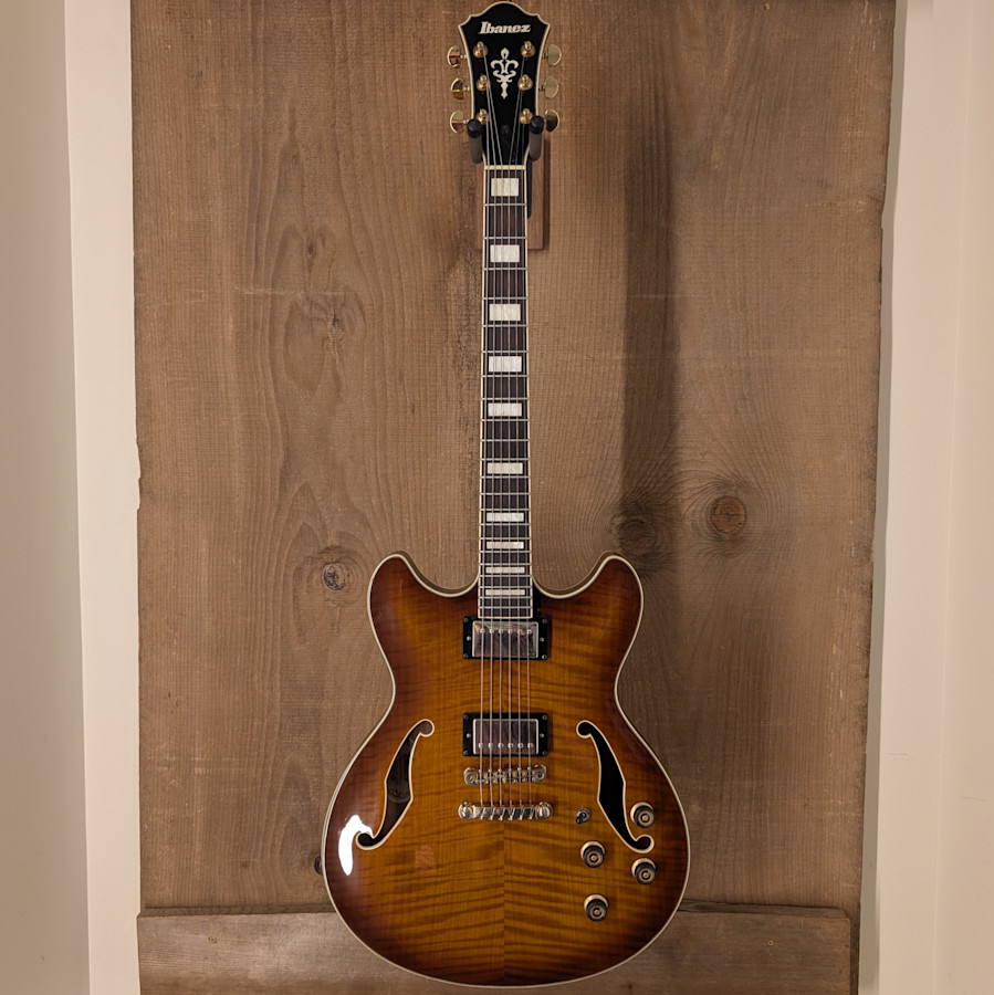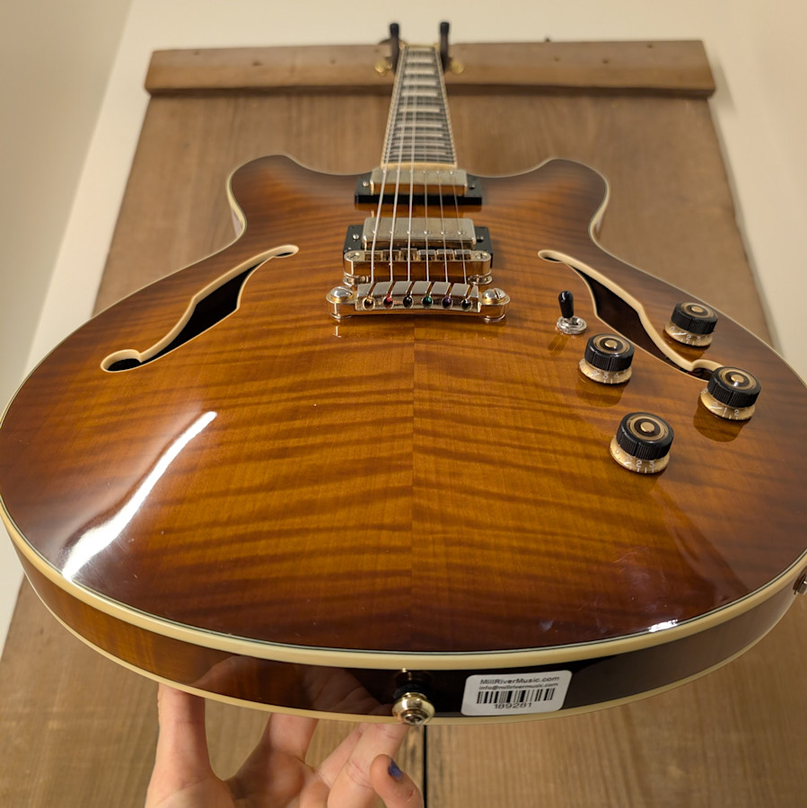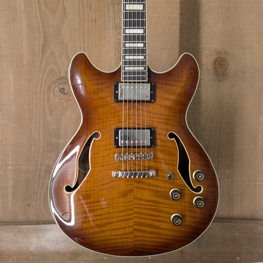 The Ibanez AS93 Artcore Expressionist is here to steal your heart. This semi-hollow guitar has a flame maple top, back, and sides for a bright and resonant sound. The Super 58 humbucker pickups support that sound without you having to worry about any additional noise that can come with a hollow body. It's a comfortable guitar, thinner and lighter than you expect when you pick it up, and the smooth, carved body makes playing feel natural and easy. Not too flashy but with plenty of soul, the AS93 has a lot of character. No case or pickguard with this one, but otherwise it's ready for you!