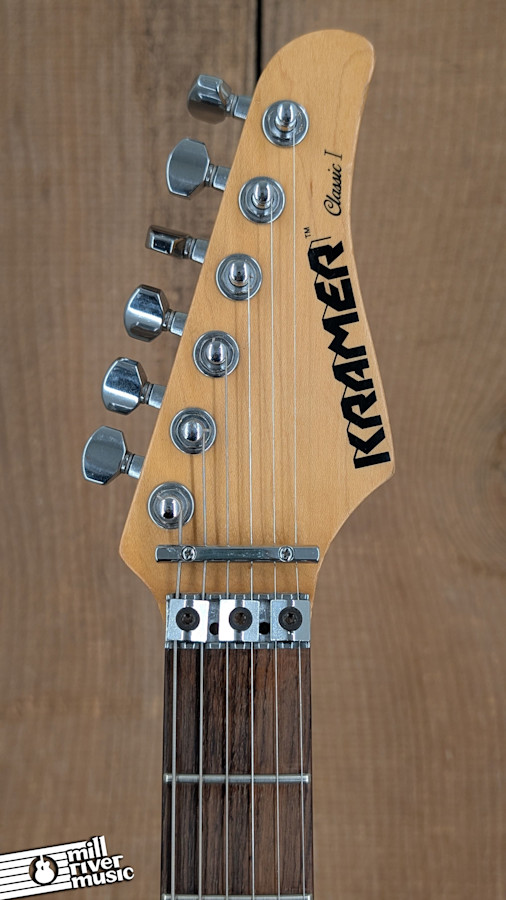 This is a Kramer Classic I from the late 1980s. The Classic I was Kramer's high-performance take on the traditional double-cutaway platform, designed for players who wanted vintage aesthetics paired with the speed and reliability Kramer was known for during the height of the shred era.