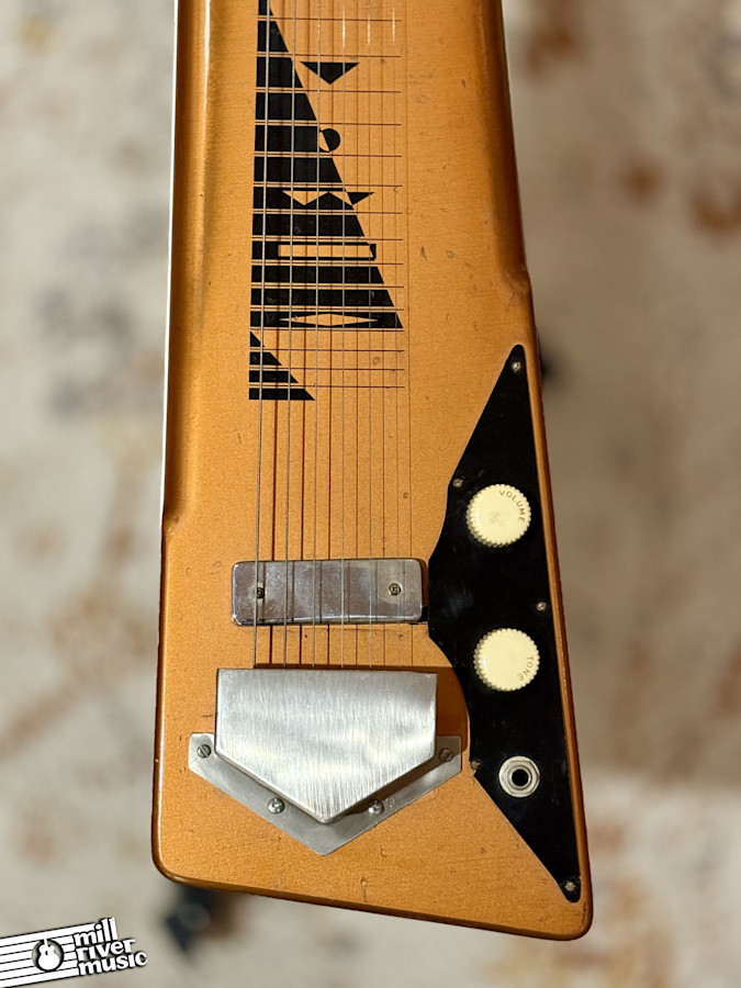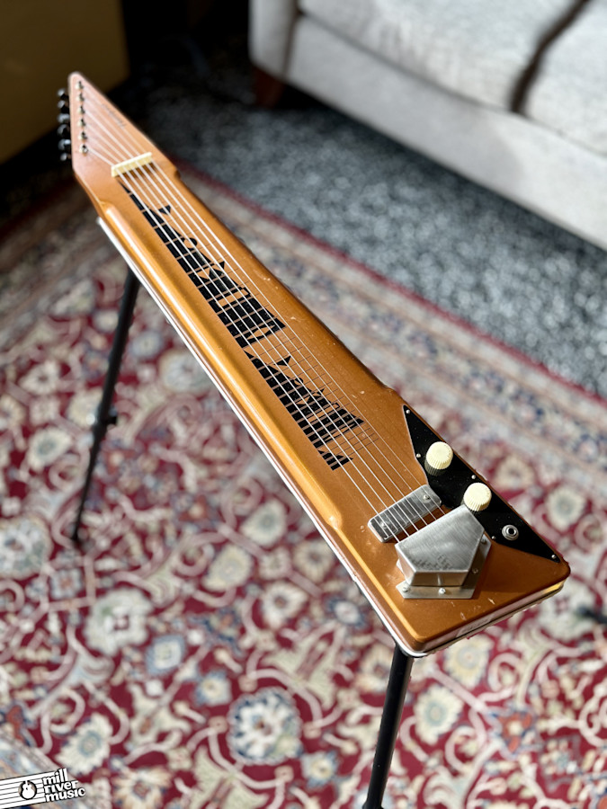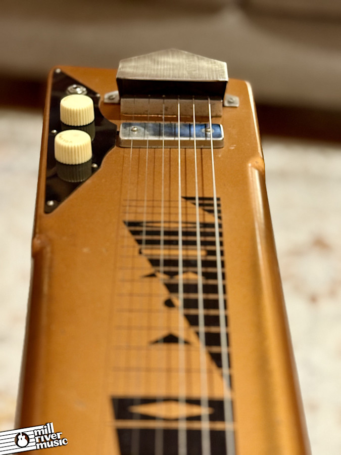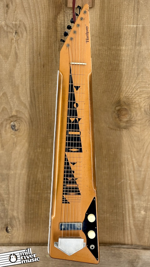 This 1965 Harmony H-1 is a fantastic and affordable way to get your foot in the door with an undeniably beautiful vintage lap steel. It's finished in a gorgeous Copper, and its striking fretboard graphics have earned it the nickname "Shark Tooth." This lap steel has that great, old-school sound, thanks to its original DeArmond "Hershey bar" pickup and original wiring harness.