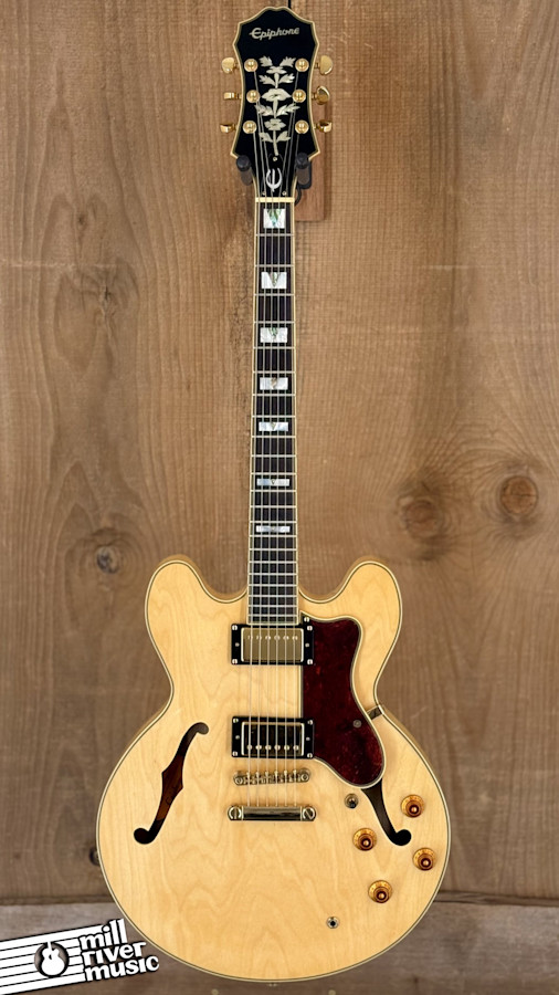 Weighing in at 8.20 lbs, this Sheraton has a substantial, high-quality feel and excellent balance. If you are looking for an established workhorse that looks as good as it sounds, this is a prime candidate. It ships in its original Epiphone hardshell case, which has one broken latch.