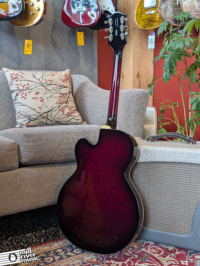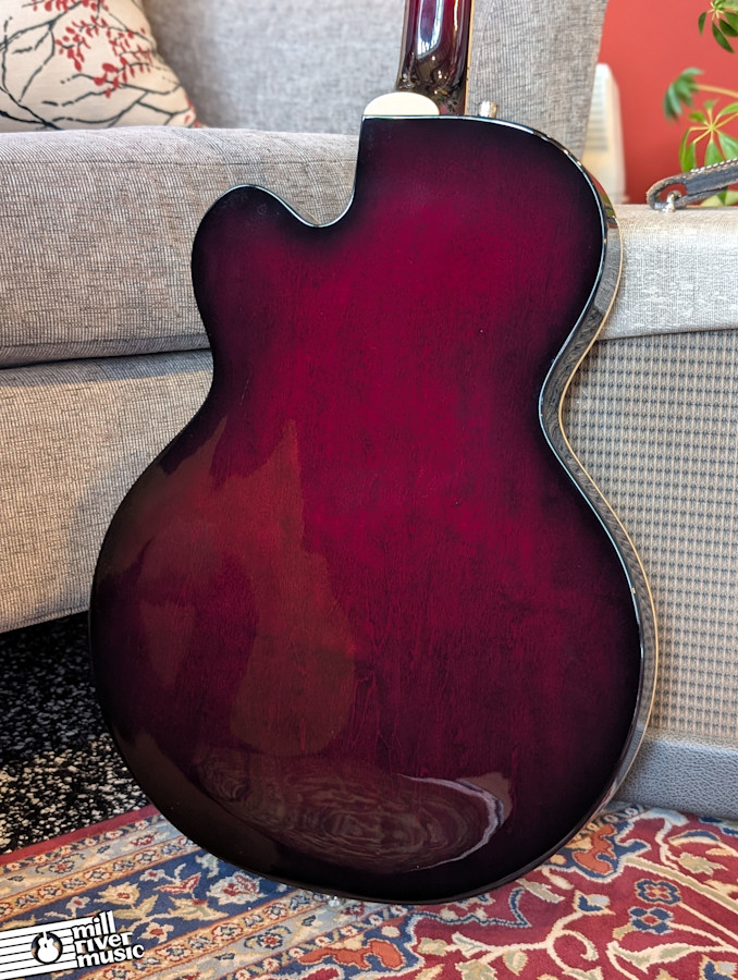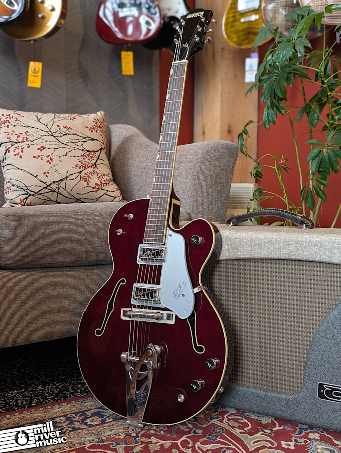The Gretsch G6119T-62 Vintage Select Edition is a stunning recreation of the classic 1962 hollow body that helped define the sound of the British Invasion and countless rockabilly records. This Tennessee Rose features a 2-inch deep maple body with simulated F-holes, a design choice specifically intended to provide the rich, resonant look of a hollow body while significantly reducing feedback at higher stage volumes. Finished in a gorgeous Dark Cherry Stain, this guitar captures the timeless aesthetic and professional feel of a golden-era Gretsch.