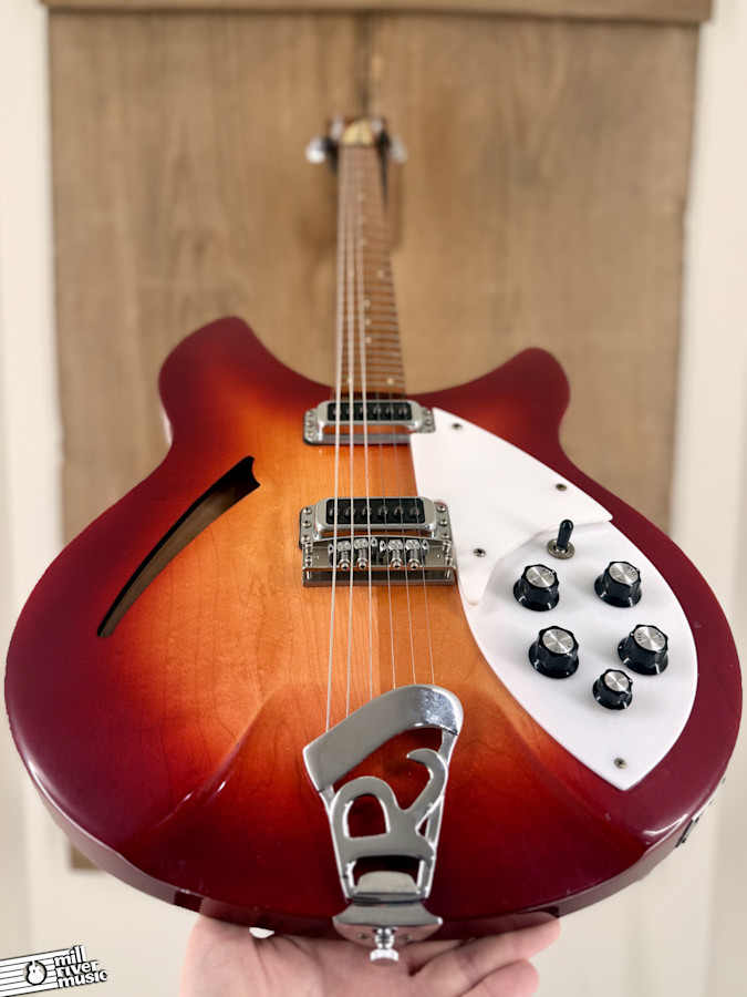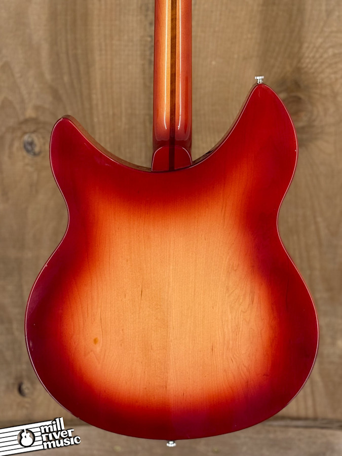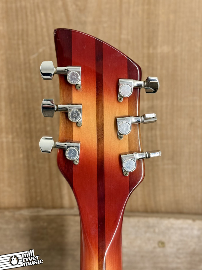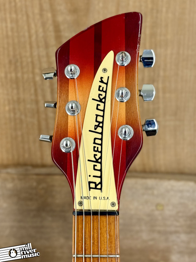 This Rickenbacker is in Very Good condition. It shows little fretwear, with the main signs of use being a bit of pick marking and light swirling in the finish, as is common with a played instrument of its age. This guitar has just been setup and has recently received a significant professional upgrade: the original bridge has been replaced with a Mastery bridge. This is a huge improvement, allowing for precise intonation and string height adjustments, as well as providing locking screws for rock-solid stability. This is a fantastic player's Rickenbacker, set up and ready to go. It includes a non-original padded gig bag.