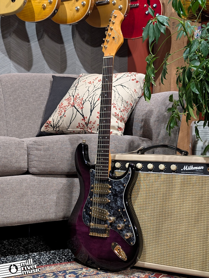 This Dean Zelinsky Tagliare is a boutique-inspired S-style electric guitar that blends traditional aesthetics with modern performance. This specific unit features a striking quilted maple top in a transparent purple finish, accented by a full set of gold hardware, including gold pickup covers and a rocking HSH pickup configuration.