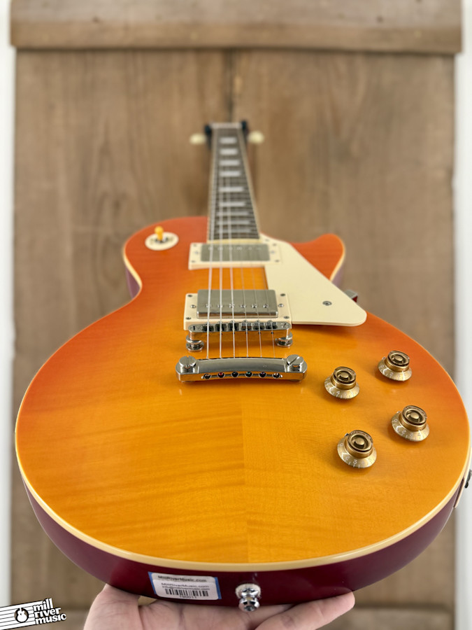 The guitar is in Very Good condition. It features a full-weight mahogany body with a maple top and AAA flame maple veneer, paired with a comfortable '59 Rounded "C" profile neck with a long neck tenon for exceptional sustain. It comes loaded with premium components, including genuine Gibson USA BurstBucker pickups, CTS pots, Mallory capacitors, and 50s era wiring, delivering that authentic, articulate, and powerful vintage tone. At 8 lbs 1 oz, it has a solid, resonant feel without .