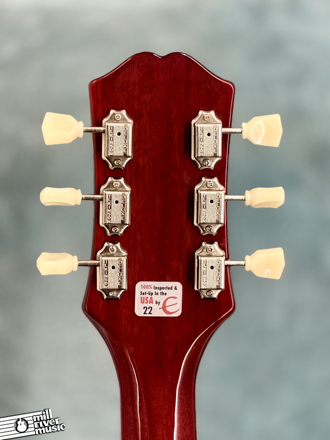 This 2022 model is in Very Good condition. The frets retain their full life and show almost no wear. Cosmetically, there are some stray surface scratches and one notable ding on the top located just above the pickguard (see dedicated photo). We also noted the presence of thin, 1-2" hairline finish cracks along each side of the fretboard at the nut. This is a relatively common occurrence on newer Epiphones; we have professionally secured these areas with specialty glue to ensure they are stable and pose no threat to the guitar's future structural integrity.