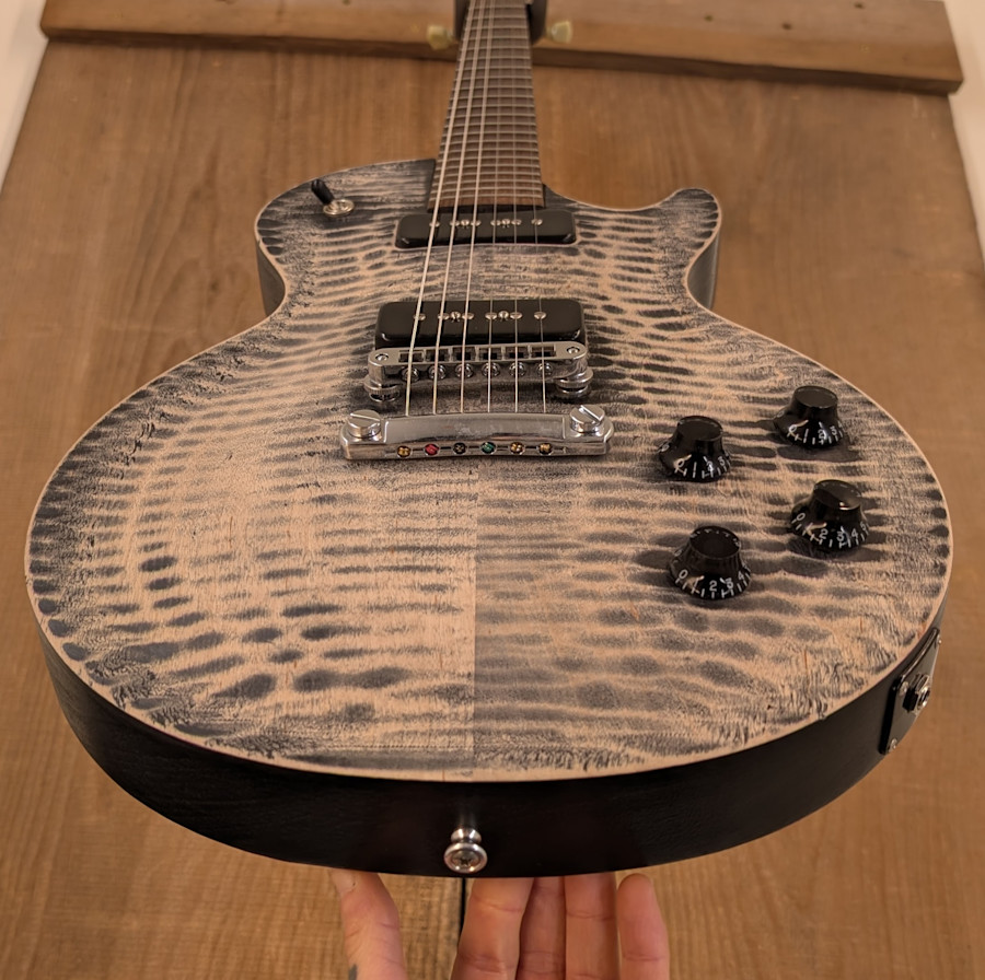 The Gibson Les Paul BFG (Barely Finished Guitar) is a raw, stripped-down rock machine that prioritizes pure tone and performance over flashy aesthetics. This specific model features the sought-after dual P90 pickup configuration, delivering the gritty, mid-forward growl and touch-sensitive dynamics that have made Gibson’s single-coils legendary. With its unique "distressed" CNC-textured maple top over a mahogany body, the BFG has an aggressive, industrial look that stands out in any collection.