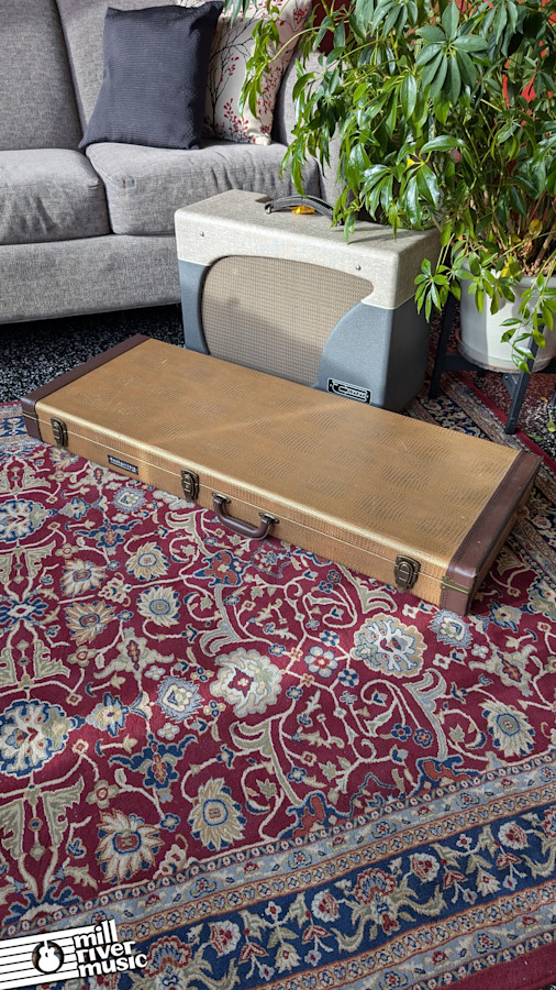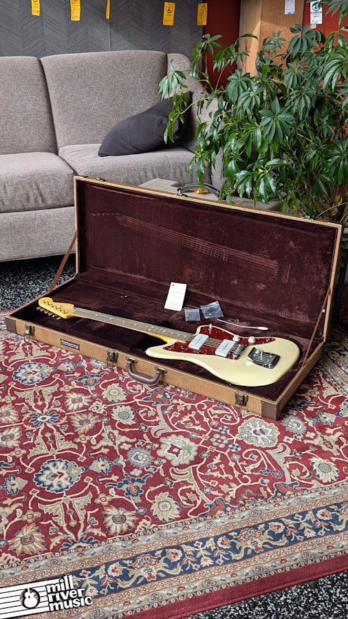 The guitar has been professionally inspected and set up in our shop. It plays beautifully with low action and features the reliable hardware upgrades that solve many of the common quirks associated with vintage offsets. This instrument includes its original Nash-branded alligator hardshell case, which is in excellent condition.