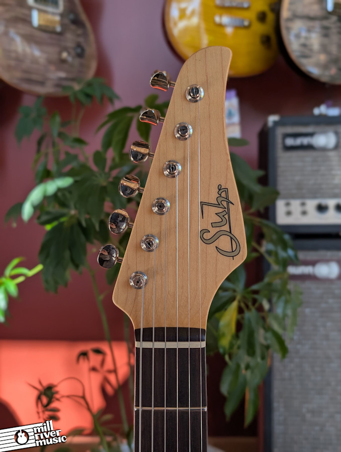 The neck is a standout feature, carved from Tinted Maple with an East Indian Rosewood fingerboard. It utilizes Suhr’s popular 60's C Vintage Medium profile ($0.830"–0.950"$), providing a substantial yet comfortable grip that fills the hand perfectly. For effortless playability, the fingerboard features a 9"–12" compound radius and heavy stainless steel frets, which offer a lightning-fast feel and will virtually never show wear.
