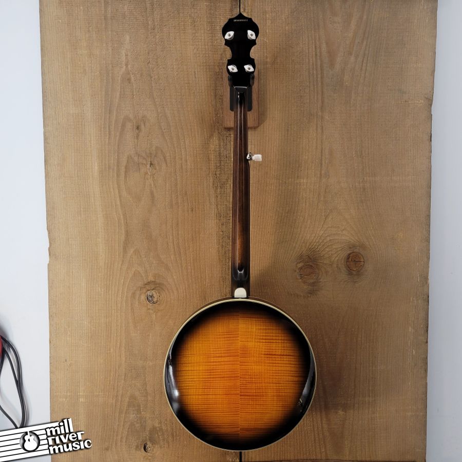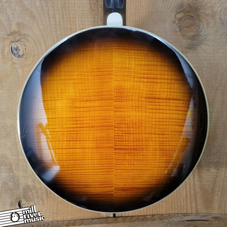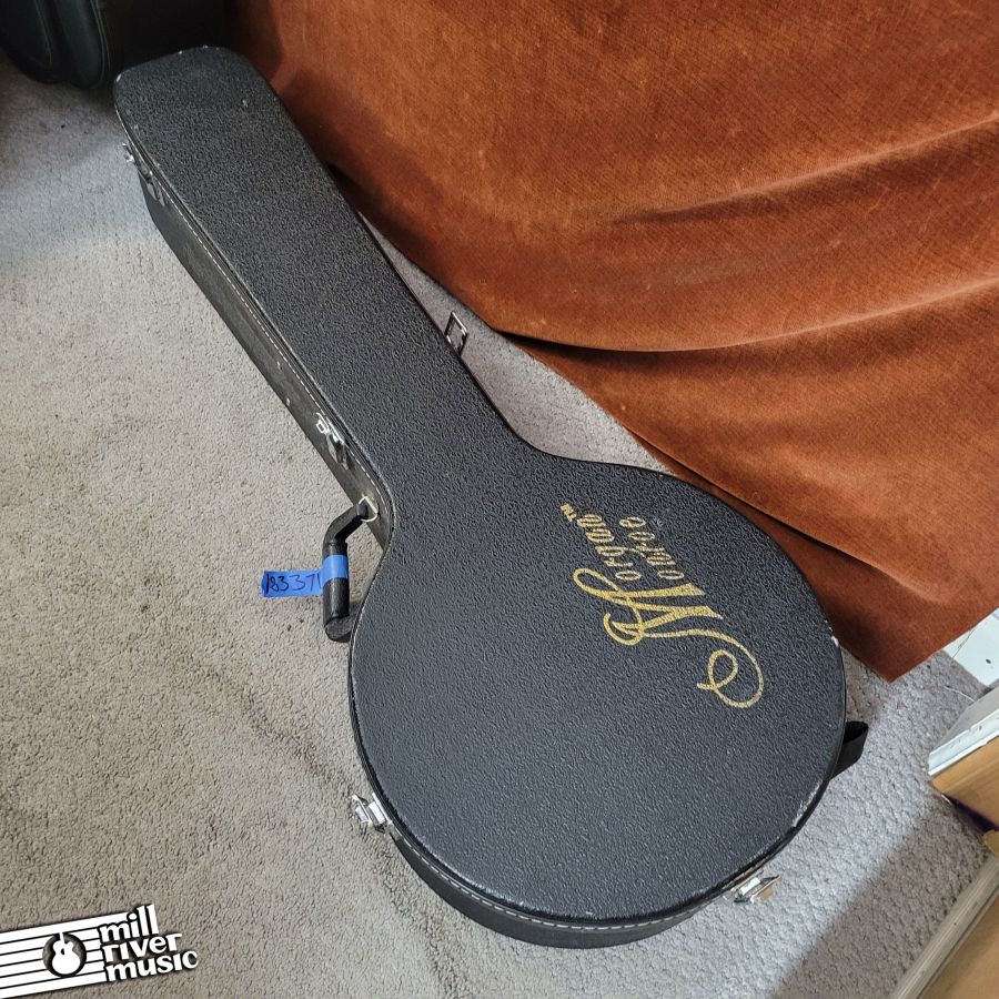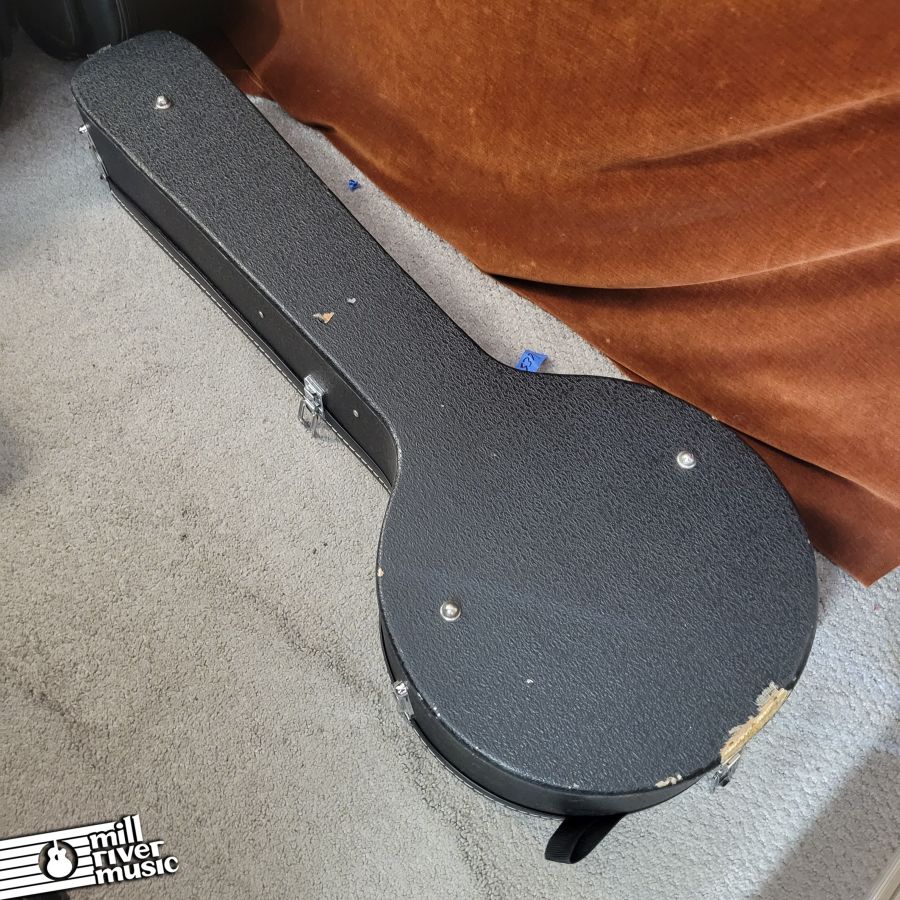 Used, in excellent condition with original hard case. A great banjo, set to spec. Has great tone, nice and loud with a classic resonator response! Tailpiece cover has a broken pin, it is in the case. Minor cosmetic wear and tear (see photo series).