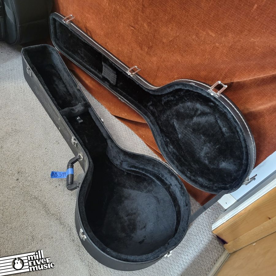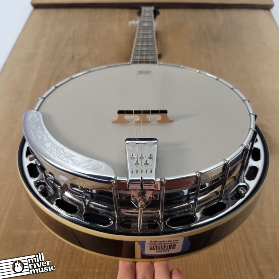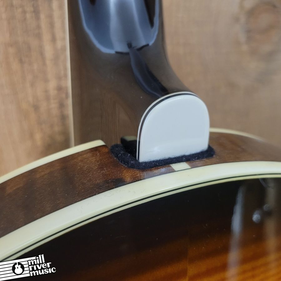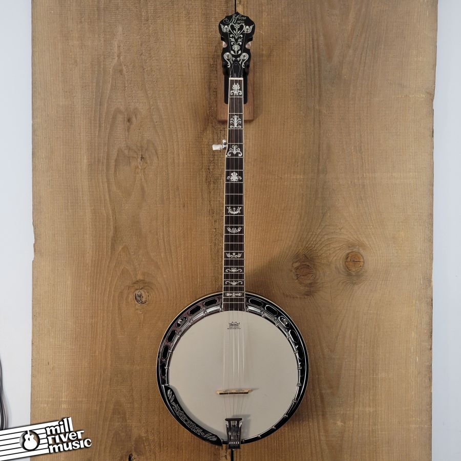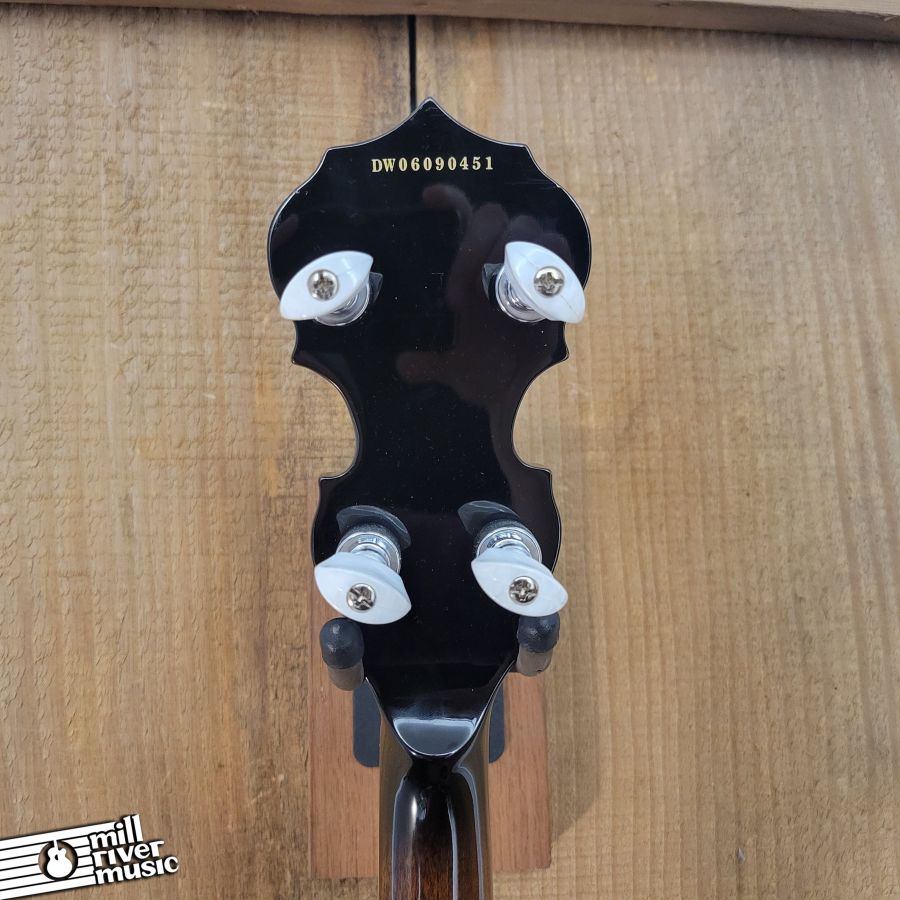 Used, in excellent condition with original hard case. A great banjo, set to spec. Has great tone, nice and loud with a classic resonator response! Tailpiece cover has a broken pin, it is in the case. Minor cosmetic wear and tear (see photo series).