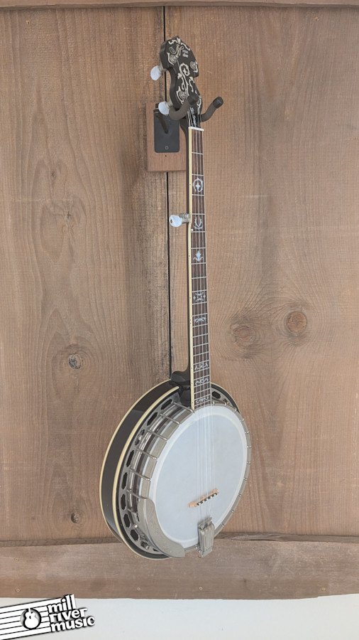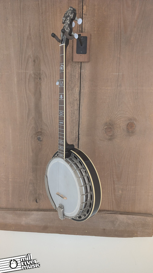 The instrument is in great shape and has been professionally set up in our shop. It is playing real shreddy with low, fast action and a nice bridge that enhances its natural resonance. Visually, the banjo stands out with a beautiful flamed maple back and a highly figured neck, giving it a premium look that matches its high-end performance.