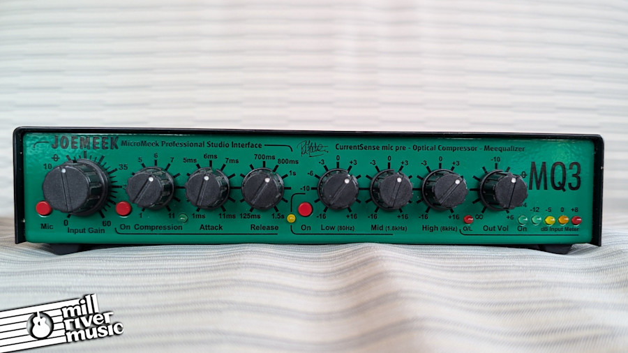 The Joemeek MQ3 MicroMeek is a compact and powerful channel strip that packs a microphone preamplifier, a three-band equalizer, and the legendary Joemeek optical compressor into a small, portable footprint. Known for its distinct green chassis and the warm, colored sound of its opto-compression circuit, the MQ3 is a favorite for adding character and vibe to vocals, bass, and acoustic instruments. It provides a musical, vintage-style saturation that modern digital plugins often try to emulate.