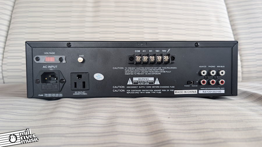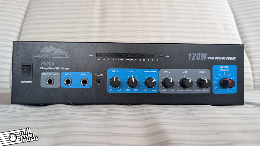 The Pyramid PA205 is a compact and reliable 120-watt mono PA amplifier designed for public address systems, small venues, or office paging setups. Offering a straightforward control layout and versatile output options—including 4, 8, and 16-ohm terminals as well as a 70V output for commercial "distributed" speaker systems—this amp is a workhorse for clear vocal projection and background music.